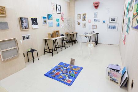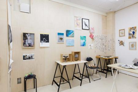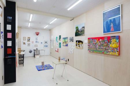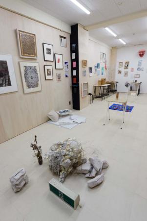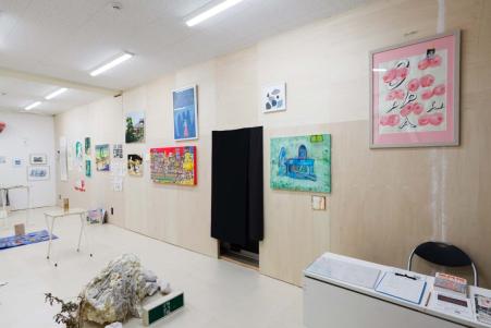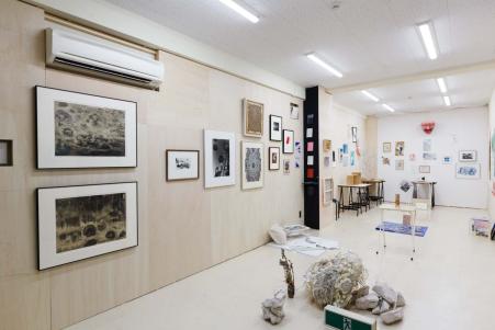 今回の展覧会では美学校のすべての教室に展示をしました。こちらは入り口入ってすぐの大教室です。普段は美術系の講座を中心に音楽、デザイン、演劇など様々な講座が行われているほか、トークショーやワークショップなどのイベントも開催しています。