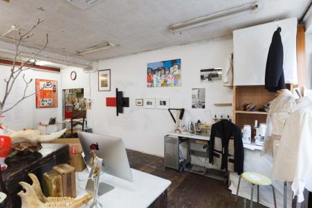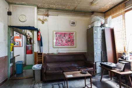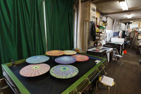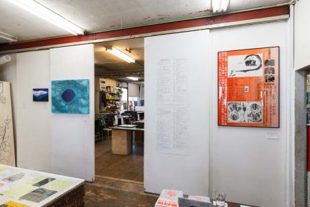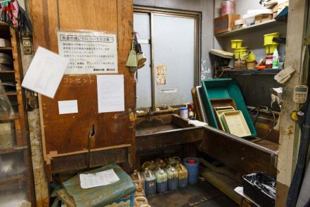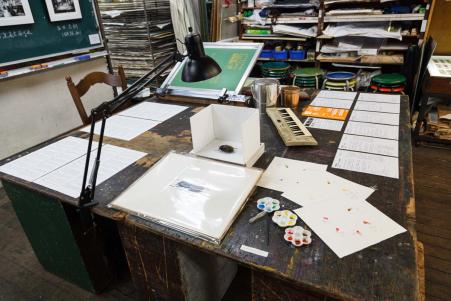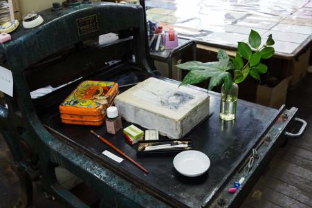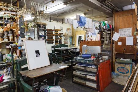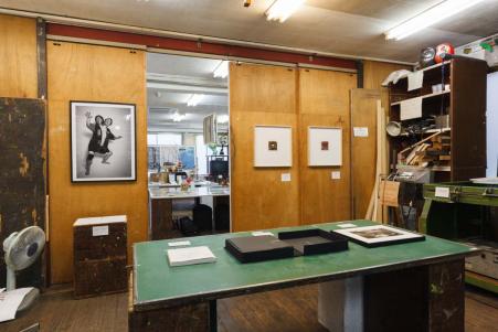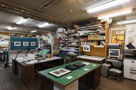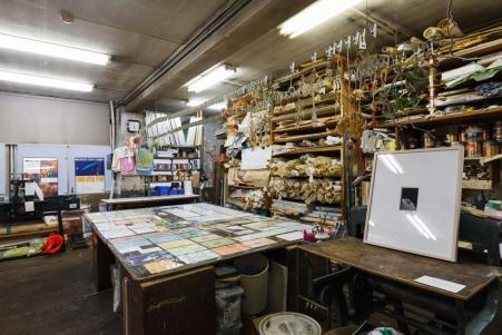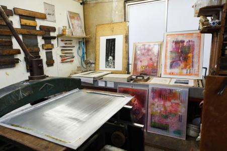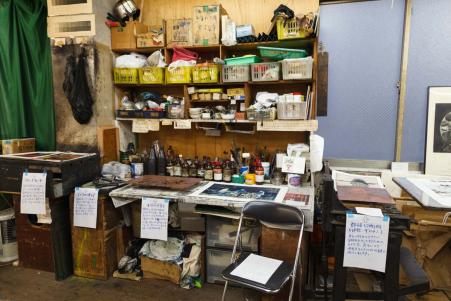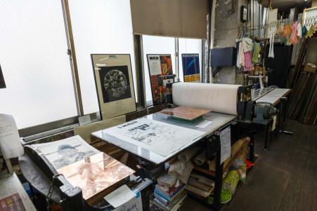 左奥は工房スペースで、石版画(リトグラフ)のプレス機、銅版画のアクワチントボックス、シルクスクリーンの製版用の水場などがあります。
