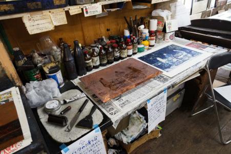 中教場の奥は自習スペースと工房です。普段は版画系の受講生が作業をしています。