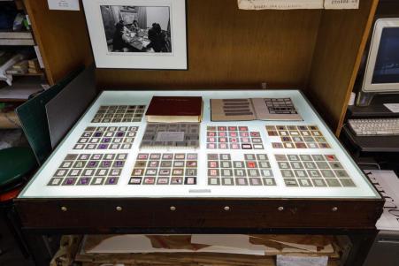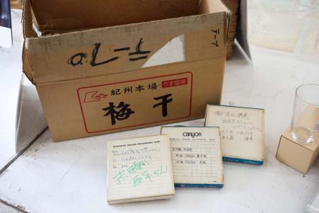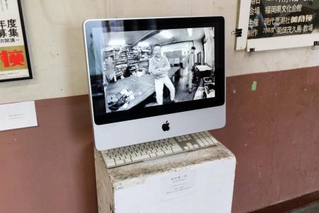 手前の開校当時から使用している黒板の上にあるのは、松澤宥さんの講座の写真や書籍。右手のライトテーブルには70年代のスライド。