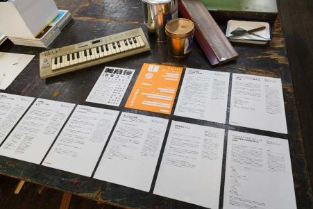 机に並べたのは開校時から現在までの講座のカリキュラムです。赤瀬川原平、菊畑茂久馬、松澤宥、中西夏之、中村宏、加納光於、笠井叡、小杉武久、鈴木清順、吉田克朗、小沢剛、久住昌之、会田誠、菊地成孔、伊東篤宏、OJUNなどなど、歴代講師のものがずらっと並びます。