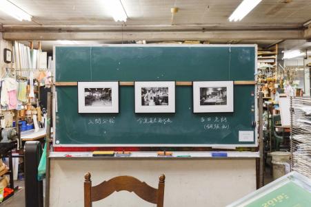 奥のテーブルでは細密画やシルクスクリーンの作業風景を再現しました。正面奥の黒板は成田秀彦さんが撮影した昔の美学校の写真。