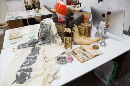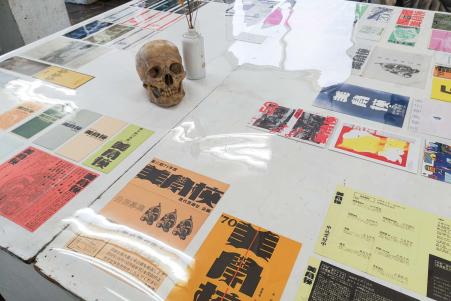 手前のテーブルには、初年度から現在までの募集チラシを並べました。机上の骸骨は中村宏教場で描かれていたモチーフです。