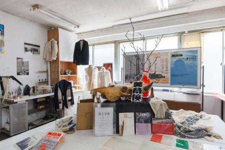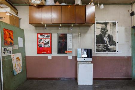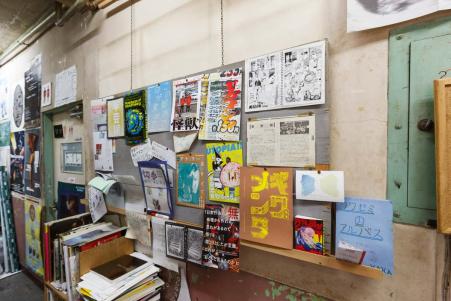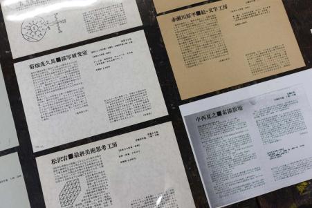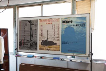 奥のホワイトボードに掲示されているのは小杉武久、松澤宥、鈴木清順らの教場の募集ポスターです。それらを取り囲むように現役講師陣の作品を配置しました。