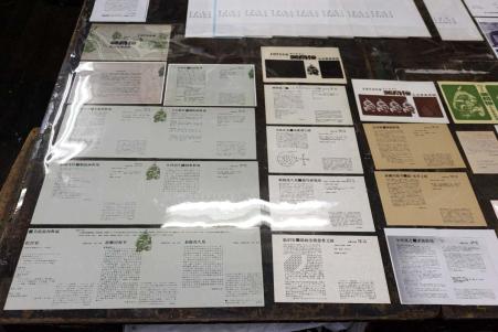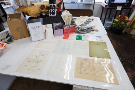 奥のテーブルには、会場でも販売していた50周年グラス、校歌レコード、書籍、1970年代の講義テープ、1970年に本校に移転する時に作られた計画書、1960年代の自立学校のパンフレット、校旗、初代事務局長・前代表の今泉省彦の講義録などを展示しました。