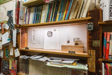 「ガロ」や「美術手帖」などの70年代からのバックナンバーが並ぶ本棚の一角は棚ガレリという常設ギャラリーになっています。50周年展に併せて、ミシェル・ザカライアスさんによる、美学校に積もった埃を用いた作品が展示されました。