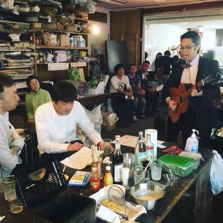 美学校に一日限りの飲屋街”美学校横町”がオープンした異色のイベント。様々な飲食店の出張店舗で飲み食いしながら、ベテラン”流し”シンガーがリクエスト曲をその場で演奏してくれます。当日ツイートまとめはこちら。