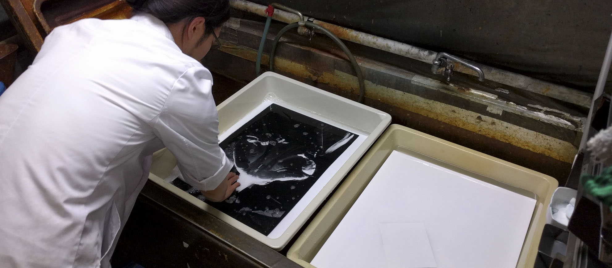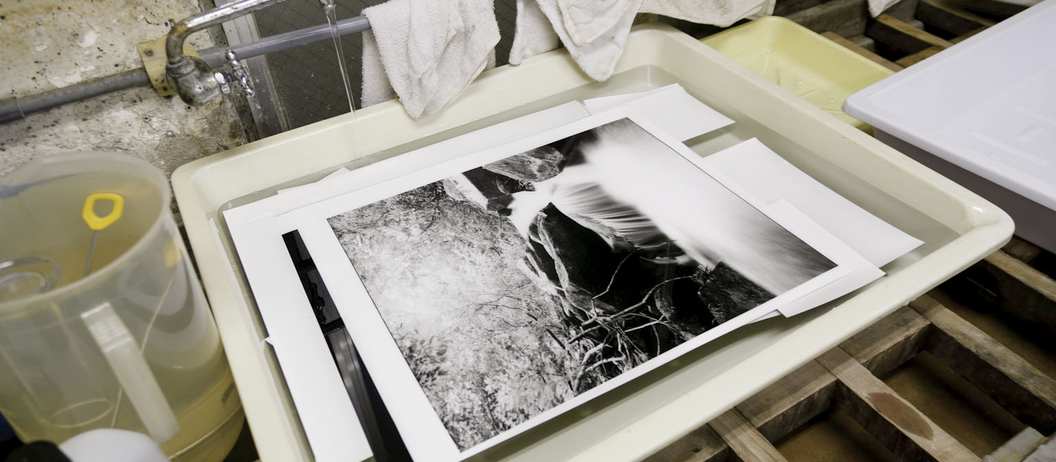 カメラの持ち方やフィルムの入れ方など、順を追って実習を進めていきます。「銀塩フィルム」による撮影、ケミカルをつかった手現像、バライタ印画紙への手焼きプリント、筆と墨による修正などが中心のカリキュラムです。