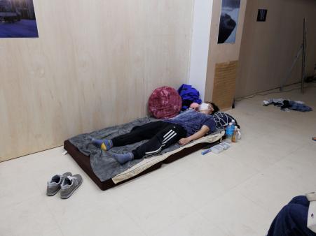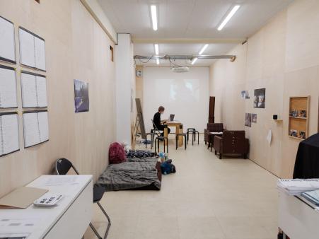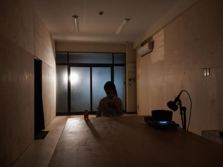4/21-24まで行われた篠田千明さんを講師とした美学校の演劇系講座「劇のやめ方」第二期修了発表会をみてきました。上演空間となる美学校スタジオは、路地の奥にあるビルの一階、大きな擦りガラスの引き戸から入って、奥に向かって細長い一室です。正面の他に採光窓のない部屋は、普段は講座や展示として使われています。