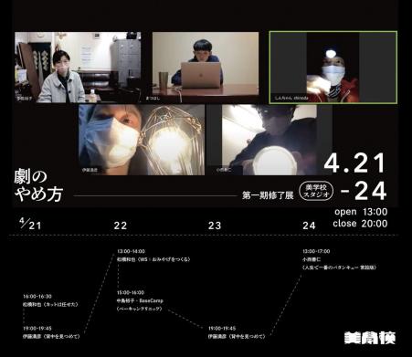 この講座では、年間の最後に修了展をやります。上演でも展示でもパフォーマンス作品でもかまいません。個々人での発表か、全員での発表になるか、それは講座の進行で変わってきます。オンラインでの実験も含んでいます。