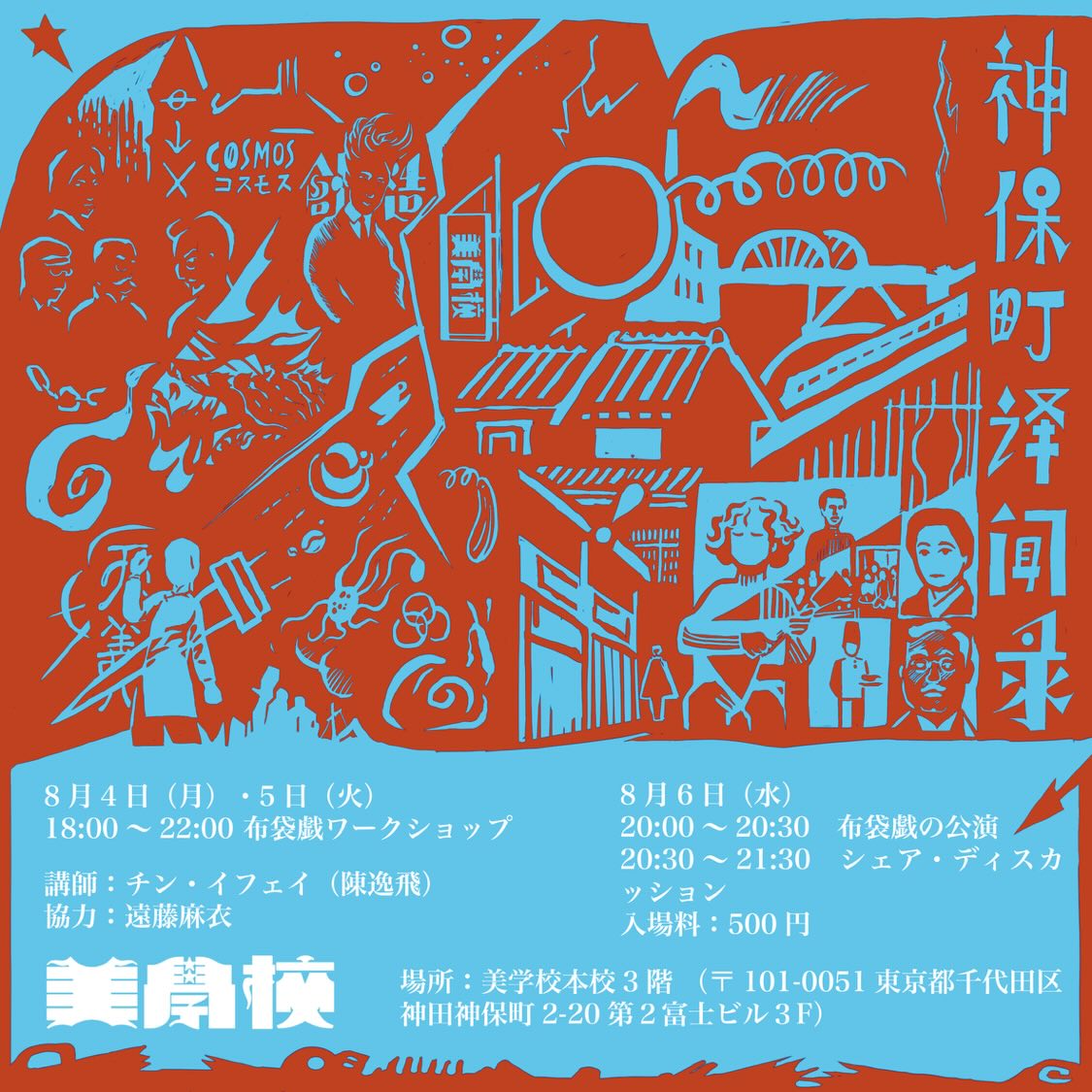 艺术家陈逸飞将在美学校举办布袋戏人偶工作坊。参与者将共同研读历史文献,并根据自身经历和兴趣,创作属于自己的人偶,了解神保町100年前作为安那其和共产主义行动者以及艺术家、知识分子跨国交流之地的历史。为期三个晚上的工作坊最后一晚将进行布袋戏公开表演。让我们来一起分享跨越百年的日中文化交流故事!