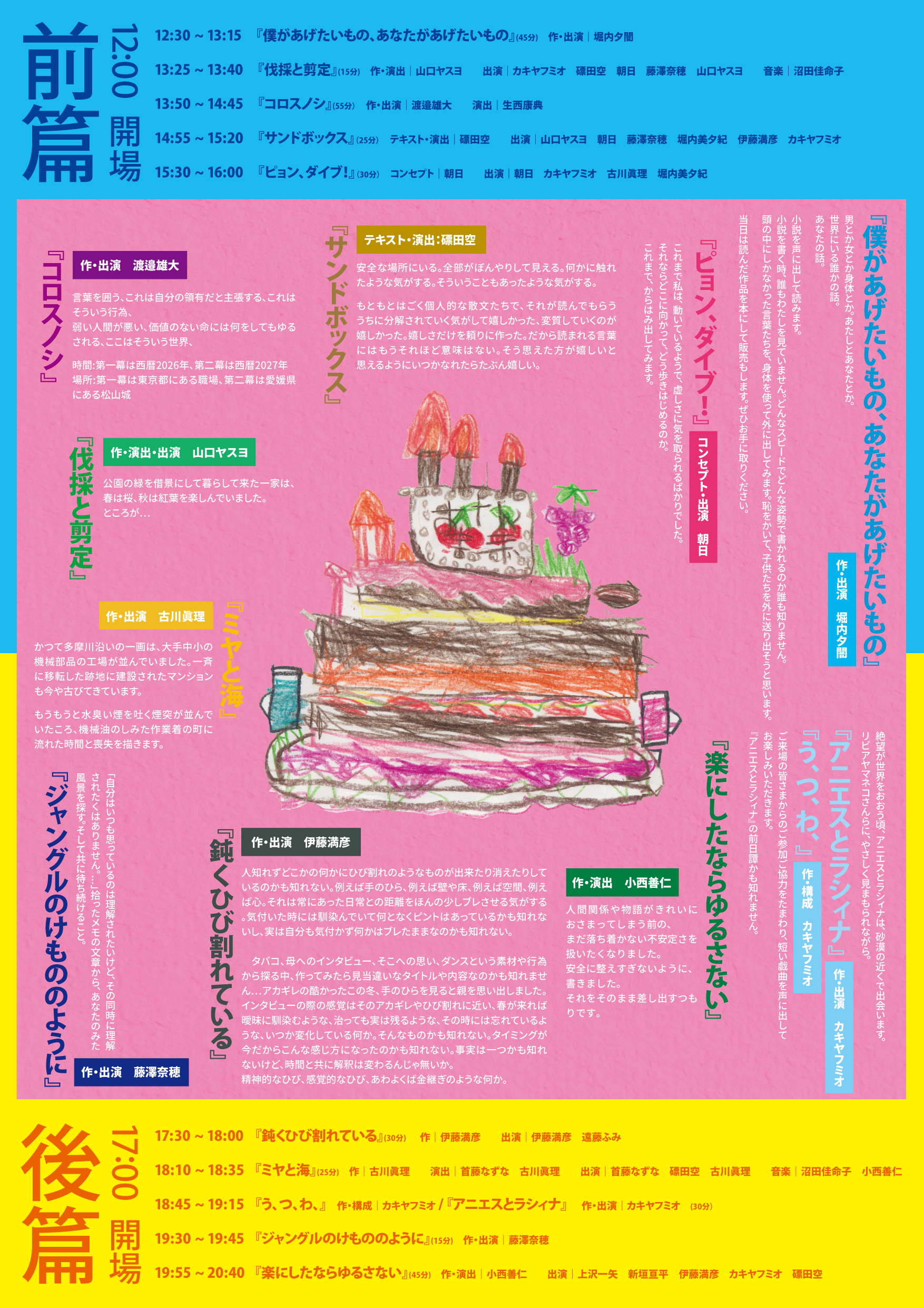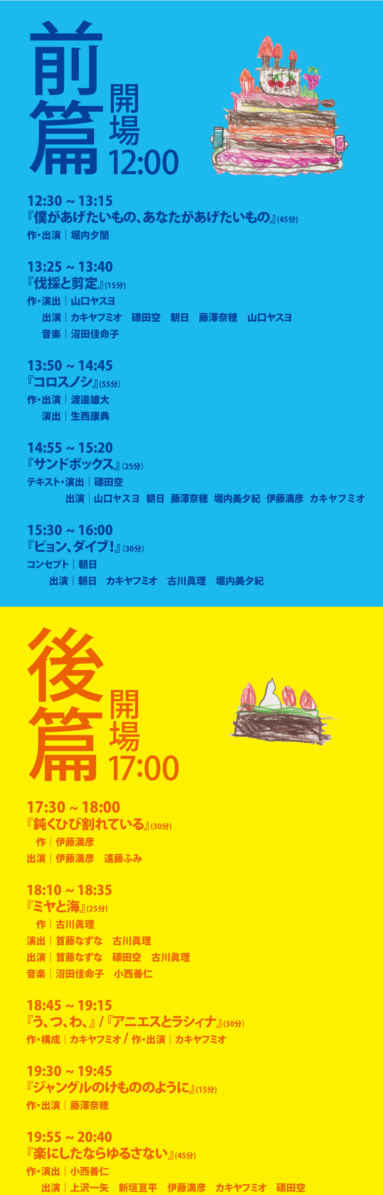 最初は全作品ぶっ通しで8時間にしようかと考えていたのですが、それはさすがに無謀すぎると昼と夜の回に分けました。本来、それぞれの作品は独立したものなのに、前篇・後篇としたのは、上手く言えないのですが、この総体がみんなで過ごした時間であり、それぞれの作品には、その人のこれまでの人生の時間が詰まっていて、バラバラの断片でしか無い個々の時間、記憶が集まったものが、人間が集って作るものであり、これが自分が考えるところの演劇というか社会なんだと思います。それは生きている人間に目を向けないで押し付けられるフィクションでは断じてないのだと。ぜひ、前篇後篇通して観て頂けたらと思います。もちろんあまりに長時間ですので、どちらかだけでも観て頂けたら幸いです。演劇というフィクションは、観客というそこに立ち会う人間がいて初めて立ち上がるものです。始まりは個人かもしれないけれど、そこにいるすべての人間のためにそれはあるはずです。