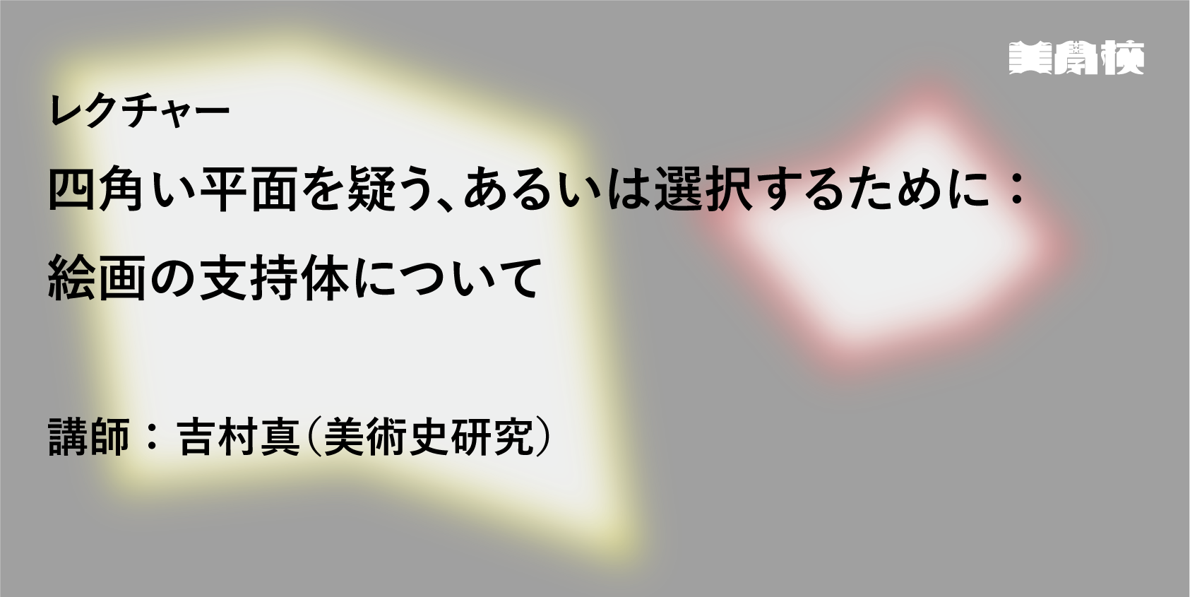 今日「美術」の形式はずいぶんと多様化しましたが、「絵画」の形式というと、人物を描くにせよ、風景を描くにせよ、いわゆる抽象画を描くにせよ、多くの人は「四角い平面」を想定するでしょう。西洋のルネサンス期に生まれた木枠に張ったキャンバスという支持体が全世界に普及したからです。しかし、この支持体の形式はなぜこれほど優勢になったのでしょうか。なんとなく「慣れている」こと以外に木枠に張ったキャンバスに描き続ける理由はあるのでしょうか。このレクチャーでは時代ごとにこの支持体がどのようなものとして捉えられてきたのか歴史を振り返りながら、絵画が「四角い平面」であることを疑ってみる、あるいは選びとる理由について考えてみます。